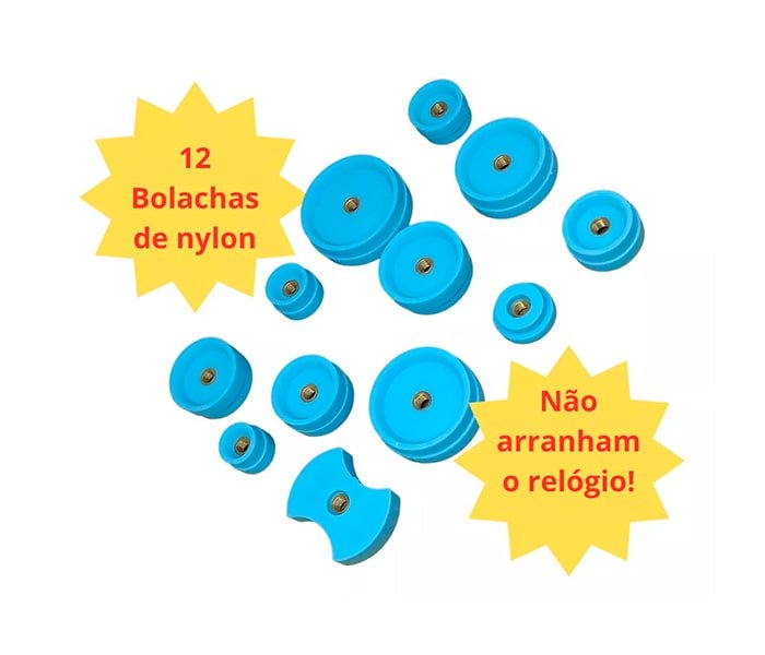 Acompanha 12 bolachas de nylon (material feito para não arranhar e nem danificar o relógio)